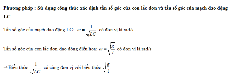 Một con lắc đơn chiều dài đang dao động điều hòa tại nơi có gia tốc rơi tự do g. Một mạch dao động gồm cuộn cảm thuần có độ tự cảm L và tụ điện có điện dung C đang hoạt động. Biểu thức \(\frac{1}{{\sqrt {LC} }}\) có cùng đơn vị với biểu thức