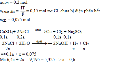 Điện phân 100 ml dung dịch hỗn hợp gồm CuSO4 a moi/1 và NaCl 2M (điện cực trơ, màng ngăn xốp, hiệu suất điện phân 100%, bỏ qua sự hòa tan của khí trong nước và sự bay hơi của nước) với cường độ dòng điện không đổi 1,25A trong 193 phút. Dung dịch sau điện phân có khối lượng giảm 9,195 gam so với dung dịch ban đầu. Giá trị của a là