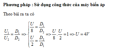 Một máy biến áp lí tưởng có hai cuộn dây D1 và D2. Khi mắc hai đầu cuộn D1 vào điện áp xoay chiều có giá trị hiệu dụng U thì điện áp hiệu dụng ở hai đầu của cuộn D2 để hở có giá trị là 8 V. Khi mắc hai đầu cuộn D2 vào điện áp xoay chiều có giá trị hiệu dụng U thì điện áp hiệu dụng ở hai đầu của cuộn D1 để hở có giá trị là 2 V. Giá trị U bằng