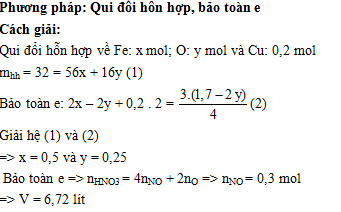 Hòa tan hết 32 gam hỗn hợp X gồm Fe, FeO và Fe2O3 vào 1 lít dung dịch HNO3 1,7M, thu được V lít khí NO (sản phẩm khử duy nhất của N+5+, ở đktc) và dung dịch Y. biết Y hòa tan tối đa 12,8 gam Cu và không có khí thoát ra.Giá trị của V là