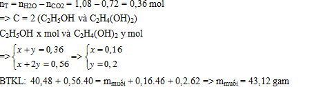 Hỗn hợp E gồm este đơn chức X và este hai chức Y (X, Y đều no, mạch hở). Xà phòng hóa hoàn toàn 40,48 gam E cần vừa đủ 560 ml dung dịch NaOH 1M, thu được hai muối có tổng khối lượng a gam và hỗn hợp T gồm hai ancol có cùng số nguyên tử cacbon. Đốt cháy toàn bộ T, thu được 16,128 lít khí CO2 (đktc) và 19,44 gam H2O. Giá trị của a gần nhất với giá trị nào sau đây?