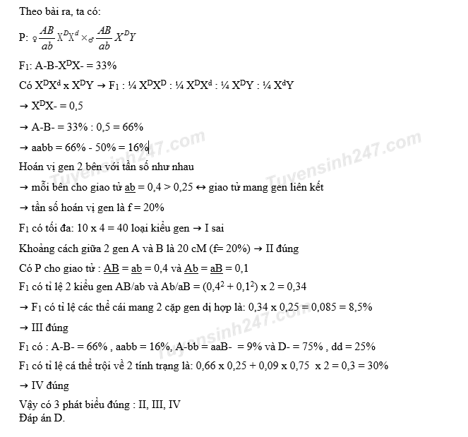, thu được F1. Trong tổng số cá thể ở F1, số cá thể cái có kiểu hình trội về cả 3 tính trạng chiếm 33%. Biết rằng mỗi gen quy định một tính trạng, các alen trội là trội hoàn toàn và không xảy ra đột biến nhưng xảy ra hoán vị gen ở cả quá trình phát sinh giao tử đực và giao tử cái với tần số bằng nhau. Theo lí thuyết, có bao nhiêu phát biểu sau đây đúng?
