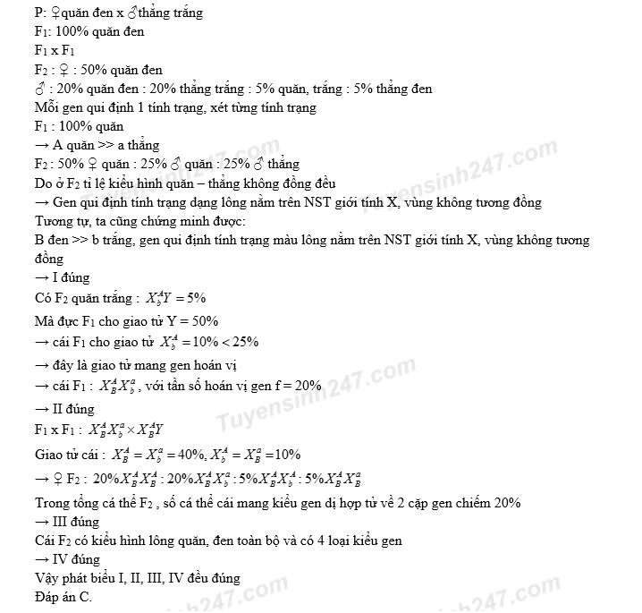 Một loài thú, cho cá thể cái lông quăn, đen giao phối với cá thể đực lông thẳng, trắng (P), thu được F1 gồm 100% cá thể lông quăn, đen. Cho F1 giao phối với nhau, thu được F2 có kiểu hình phân li theo tỉ lệ: 50% cá thể cái lông quăn, đen : 20% cá thể đực lông quăn, đen : 20% cá thể đực lông thẳng, trắng : 5% cá thể đực lông quăn, trắng : 5% cá thể đực lông thẳng, đen. Cho biết mỗi gen quy định một tính trạng và không xảy ra đột biến. Theo lí thuyết, có bao nhiêu phát biểu sau đây đúng?
