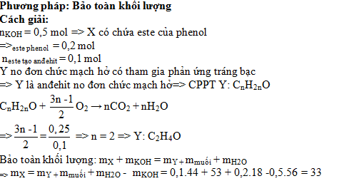 Cho 0,3 mol hỗn hợp X gồm hai este đơn chức tác dụng vừa đủ với 250 ml dung dịch KOH 2M, thu được chất hữu cơ Y (no, đơn chức, mạch hở có tham gia phản ưng tráng bạc) và 53 gam hỗn hợp muối. Đốt cháy toàn bộ Y cần vừa đủ 5,6 lít khí O2 (đktc). Khối lượng của 0,3 mol X là