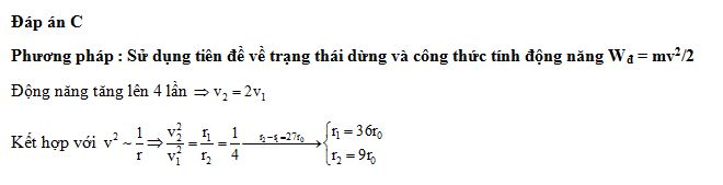 Xét nguyên tử hiđrô theo mẫu nguyên tử Bo. Electron trong nguyên tử chuyển từ quỹ đạo dừng m1 về quỹ đạo dừng m2 thì bán kính giảm 27r0 (r0 là bán kính Bo), đồng thời động năng của êlectron tăng thêm 300%. Bán kính của quỹ đạo dừng m1 có giá trị gần nhất với giá trị nào sau đây?