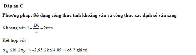 Trong thí nghiệm Y-âng về giao thoa với ánh sáng đơn sắc có bước sóng 0,6 μm. Biết khoảng cách giữa hai khe là 0,6 mm, khoảng cách từ mặt phẳng chứa hai khe đến màn quan sát là 2 m. Trên màn, hai điểm M và N nằm khác phía so với vân sáng trung tâm, cách vân trung tâm lần lượt là 5,9 mm và 9,7 mm. Trong khoảng giữa M và N có số vân sáng là