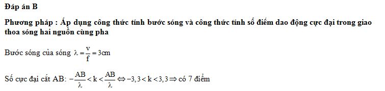 Giao thoa sóng ở mặt nước với hai nguồn kết hợp đặt tại A và B. Hai nguồn dao động điều hòa theo phương thẳng đứng, cùng pha và cùng tần số 10 Hz. Biết AB = 20 cm, tốc độ truyền sóng ở mặt nước là 0,3 m/s. Ở mặt nước, gọi D là đường thẳng đi qua trung điểm của AB và hợp với AB một góc 60°. Trên D có bao nhiêu điểm mà các phần tử ở đó dao động với biên độ cực đại?