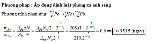 Chất phóng xạ pôlôni \(_{84}^{210}Po\) phát ra tia α và biến đổi thành chì. Cho chu kì bán rã của pôlôni là 138 ngày. Ban đầu có một mẫu pôlôni nguyên chất, sau khoảng thời gian t thì tỉ số giữa khối lượng chì sinh ra và khối lượng pôlôni còn lại trong mẫu là 0,6. Coi khối lượng nguyên từ bằng số khối của hạt nhân của nguyên tử đó tính theo đơn vị u. Giá trị của t là