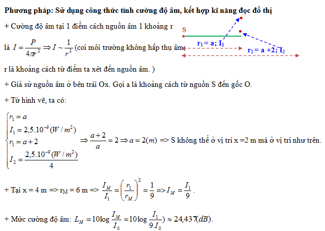 Tại một điểm trên trục Ox có một nguồn âm điểm phát âm đẳng hướng ra môi trường. Hình vẽ bên là đồ thị biểu diễn sự phụ thuộc của cường độ âm I tại những điểm trên trục Ox theo tọa độ x. Cường độ âm chuẩn là I0 = 10-12 W/m2. M là điểm trên trục Ox có tọa độ x = 4 m. Mức cường độ âm tại M có giá trị gần nhất với giá trị nào sau đây?