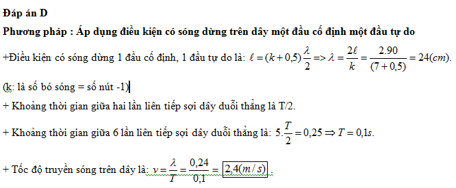 Một sợi đây đàn hồi dài 90 cm có một đầu cố định và một đầu tự do đang có sóng dừng. Kể cả đầu dây cố định, trên dây có 8 nút. Biết rằng khoảng thời gian giữa 6 lần liên tiếp sợi dây duỗi thẳng là 0,25 s. Tốc độ truyền sóng trên dây là