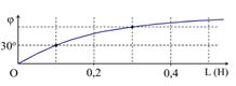 Đặt điện áp xoay chiều u có tần số góc ω= 173,2 rad/s vào hai đầu đoạn mạch mắc nối tiếp gồm điện trở R và cuộn cảm thuần có độ tự cảm L thay đổi được. Gọi i là cường độ dòng điện trong đoạn mạch, j là độ lệch pha giữa u và i. Hình bên là đồ thị biểu diễn sự phụ thuộc của j theo L.