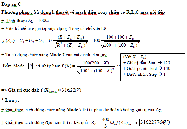 Đặt điện áp xoay chiều u = 100 cos(100πt + π/3) (V) t tính bằng s) vào hai đầu đoạn mạch gồm đỉện trở 100 Ω, cuộn dây cảm thuần có độ tự cảm 1/π (H) và tụ điện có điện dung C thay đổi được (hình vẽ). V1, V2 và V3 là các vôn kế xoay chiều có điện trở rất lớn. Điều chỉnh C để tổng số chỉ cùa ba vôn kế có giá trị cực đại, giá trị cực đại này là