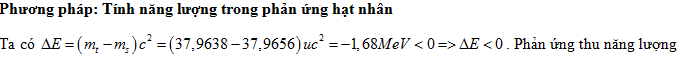 Trong một phản ứng hạt nhân, tổng khối lượng nghỉ của các hạt trước phản ứng là 37,9638 u và tổng khối lượng nghỉ các hạt sau phản ứng là 37,9656 u. Lấy 1 u = 931,5 MeV/c2. Phản ứng này