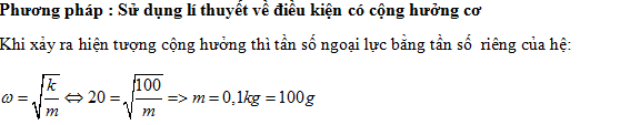 Một con lắc lò xo gồm lò xo có độ cứng 100 N/m và vật nhỏ có khối lượng m. Tác dụng lên vật ngoại lực F = 20cos10πt (N) (t tính bằng s) dọc theo trục lò xo thì xảy ra hiện tượng cộng hưởng. Lấy π2 = 10. Giá trị của m là