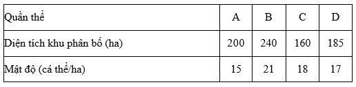 Giả sử 4 quần thể của một loài thú được kí hiệu là A, B, C, D có diện tích khu phân bố và mật độ cá thể như sau: