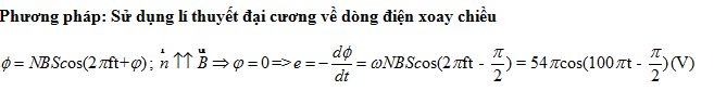 Một khung dây dẫn phăng, dẹt có 200 vòng, mỗi vòng có diện tích 600 cm2. Khung dây quay đều quanh trục nằm trong mặt phẳng khung, trong một từ trường đều có vectơ cảm ứng từ vuông góc với trục quay và có độ lớn 4,5.10-2 T. Suất điện động e trong khung có tần số 50 Hz. Chọn gốc thời gian lúc pháp tuyến của mặt phẳng khung cùng hướng với vectơ cảm ứng từ. Biểu thức của e là