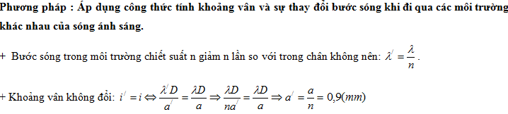 Trong thí nghiệm Y-âng về giao thoa với ánh sáng đơn sắc, khoảng cách giữa hai khe là 1,2 mm. Ban đầu, thí nghiệm được tiến hành trong không khí. Sau đó, tiến hành thí nghiệm trong nước có chiết suất 4/3 đối với ánh sáng đơn sắc nói trên. Đề khoảng vân trên màn quan sát không đổi so với ban đầu, người ta thay đổi khoảng cách giữa hai khe hẹp và giữ nguyên các điều kiện khác. Khoảng cách giữa hai khe lúc này bằng
