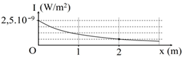 Tại một điểm trên trục Ox có một nguồn âm điểm phát âm đẳng hướng ra môi trường. Hình vẽ bên là đồ thị biểu diễn sự phụ thuộc của cường độ âm I tại những điểm trên trục Ox theo tọa độ x. Cường độ âm chuẩn là I0 = 10-12 W/m2. M là điểm trên trục Ox có tọa độ x = 4 m. Mức cường độ âm tại M có giá trị gần nhất với giá trị nào sau đây?
