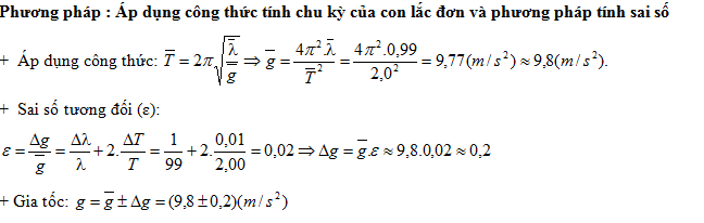 Tiến hành thí nghiệm đo gia tốc trọng trường bằng con lắc đơn, một học sinh đo được chiều dài con lắc là 99 ± 1 (cm), chu kì dao động nhỏ của nó là 2,00 ± 0,01 (s). Lấy π2 = 9,87 và bỏ qua sai số của số π. Gia tốc trọng trường do học sinh đo được tại nơi làm thí nghiệm là