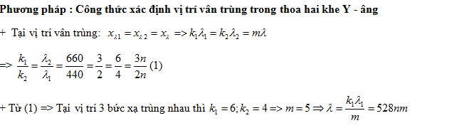 Trong thí nghiệm Y- âng về giao thoa ánh sáng, hai khe được chiếu bằng ánh sáng trắng có bước sóng từ 380 nm đến 760 nm. Trên màn quan sát, tồn tại vị trí mà ở đó có đúng ba bức xạ cho vân sáng ứng với các bước sóng là 440 nm, 660 nm và λ . Giá trị của λ gần nhất với giá trị nào sau đây?