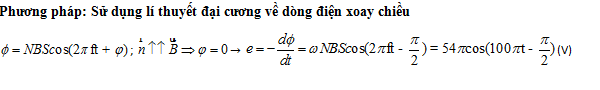 Một khung dây dẫn phăng, dẹt có 200 vòng, mỗi vòng có diện tích 600 cm2. Khung dây quay đều quanh trục nằm trong mặt phẳng khung, trong một từ trường đều có vectơ cảm ứng từ vuông góc với trục quay và có độ lớn 4,5.10-2 T. Suất điện động e trong khung có tần số 50 Hz. Chọn gốc thời gian lúc pháp tuyến của mặt phẳng khung cùng hướng với vectơ cảm ứng từ. Biểu thức của e là