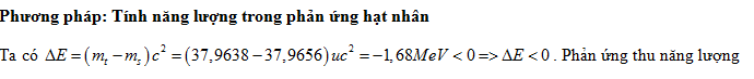 Trong một phản ứng hạt nhân, tổng khối lượng nghỉ của các hạt trước phản ứng là 37,9638 u và tổng khối lượng nghỉ các hạt sau phản ứng là 37,9656 u. Lấy 1 u = 931,5 MeV/c2. Phản ứng này
