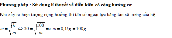 Một con lắc lò xo gồm lò xo có độ cứng 100 N/m và vật nhỏ có khối lượng m. Tác dụng lên vật ngoại lực F = 20cos10πt (N) (t tính bằng s) dọc theo trục lò xo thì xảy ra hiện tượng cộng hưởng. Lấy π2 = 10. Giá trị của m là