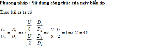 Một máy biến áp lí tưởng có hai cuộn dây D1 và D2. Khi mắc hai đầu cuộn D1 vào điện áp xoay chiều có giá trị hiệu dụng U thì điện áp hiệu dụng ở hai đầu của cuộn D2 để hở có giá trị là 8 V. Khi mắc hai đầu cuộn D2 vào điện áp xoay chiều có giá trị hiệu dụng U thì điện áp hiệu dụng ở hai đầu của cuộn D1 để hở có giá trị là 2 V. Giá trị U bằng