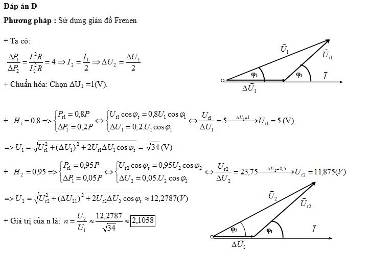 Điện năng được truyền từ trạm phát điện đến nơi tiêu thụ bằng đường dây tải điện một pha. Ban đầu hiệu suất truyền tải là 80%. Cho công suất truyền đi không đổi và hệ số công suất ở nơi tiêu thụ (cuối đường dây tải điện) luôn bằng 0,8. Để giảm hao phí trên đường dây 4 lần thì cần phải tăng điện áp hiệu dụng ở trạm phát điện lên n lần. Giá trị của n là