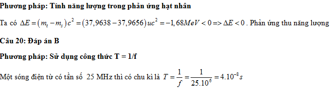 Trong một phản ứng hạt nhân, tổng khối lượng nghỉ của các hạt trước phản ứng là 37,9638 u và tổng khối lượng nghỉ các hạt sau phản ứng là 37,9656 u. Lấy 1 u = 931,5 MeV/c2. Phản ứng này