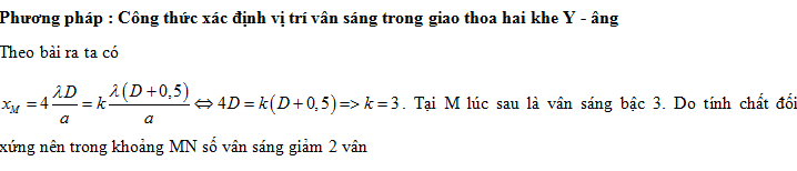 Trong thí nghiệm Y-âng về giao thoa với ánh sáng đơn sắc, khoảng cách từ mặt phẳng chứa hai khe đến màn quan sát là 1,5 m. Trên màn quan sát, hai điểm M và N đối xứng qua vân trung tâm có hai vân sáng bậc 4. Dịch màn ra xa hai khe thêm một đoạn 50 cm theo phương vuông góc với mặt phẳng chứa hai khe. So với lúc chưa dịch chuyển màn, số vân sáng trên đoạn MN lúc này giảm đi