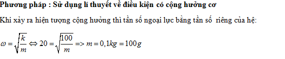 Một con lắc lò xo gồm lò xo có độ cứng 100 N/m và vật nhỏ có khối lượng m. Tác dụng lên vật ngoại lực F = 20cos10πt (N) (t tính bằng s) dọc theo trục lò xo thì xảy ra hiện tượng cộng hưởng. Lấy = 10. Giá trị của m là