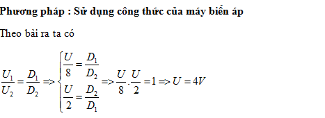 Một máy biến áp lí tưởng có hai cuộn dây D1 và D2. Khi mắc hai đầu cuộn D1 vào điện áp xoay chiều có giá trị hiệu dụng U thì điện áp hiệu dụng ở hai đầu của cuộn D2 để hở có giá trị là 8 V. Khi mắc hai đầu cuộn D2 vào điện áp xoay chiều có giá trị hiệu dụng U thì điện áp hiệu dụng ở hai đầu của cuộn D1 để hở có giá trị là 2 V. Giá trị U bằng