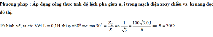 Đặt điện áp xoay chiều u có tần số góc ω= 173,2 rad/s vào hai đầu đoạn mạch mắc nối tiếp gồm điện trở R và cuộn cảm thuần có độ tự cảm L thay đổi được. Gọi i là cường độ dòng điện trong đoạn mạch, j là độ lệch pha giữa u và i. Hình bên là đồ thị biểu diễn sự phụ thuộc của j theo L. Giá trị của R là