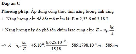 Trong y học, người ta dùng một laze phát ra chùm sáng có bước sóng λ để “đốt” các mô mềm. Biết rằng để đốt được phần mô mềm có thể tích 6mm3 thì phần mô này cần hấp thụ hoàn toàn năng lượng của 45.408 phôtôn của chùm laze trên. Coi năng lượng trung bình để đốt hoàn toàn 1 mm3mô là 2,53 J. Lấy h =6,625.10-34 J.s. Giá trị của λ là