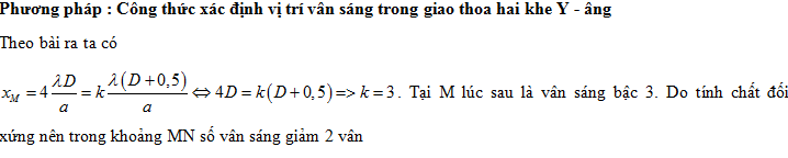 Trong thí nghiệm Y-âng về giao thoa với ánh sáng đơn sắc, khoảng cách từ mặt phẳng chứa hai khe đến màn quan sát là 1,5 m. Trên màn quan sát, hai điểm M và N đối xứng qua vân trung tâm có hai vân sáng bậc 4. Dịch màn ra xa hai khe thêm một đoạn 50 cm theo phương vuông góc với mặt phẳng chứa hai khe. So với lúc chưa dịch chuyển màn, số vân sáng trên đoạn MN lúc này giảm đi