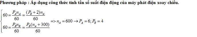 Hai máy phát điện xoay chiều một pha A và B (có phần cảm là rôto) đang hoạt động ổn định, phát ra hai suất điện động có cùng tần số 60 Hz. Biết phần cảm của máy A nhiều hơn phần cảm của máy B 2 cặp cực (2 cựcbắc, 2 cực nam) và trong 1 giờ số vòng quay của rôto hai máy chênh lệch nhau 18000 vòng. Số cặp cực của máy A và máy B lần lượt là