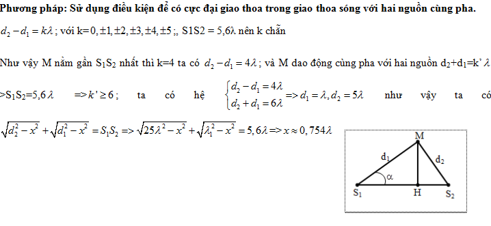 Ở mặt nước, tại hai điểm S1 và S2 có hai nguồn sóng kết hợp, dao động điều hòa, cùng pha theo phương thẳng đứng. Biết sóng truyền trên mặt nước với bước sóng λ, khoảng cách S1S2 = 5,6λ. Ở mặt nước, gọi M là vị trí mà phần tử nước tại đó dao động với biên độ cực đại, cùng pha với dao động của hai nguồn. Khoảng cách ngắn nhất từ M đến đường thẳng S1S2 là