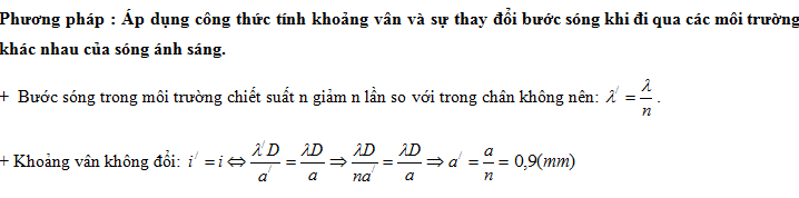 Trong thí nghiệm Y-âng về giao thoa với ánh sáng đơn sắc, khoảng cách giữa hai khe là 1,2 mm. Ban đầu, thí nghiệm được tiến hành trong không khí. Sau đó, tiến hành thí nghiệm trong nước có chiết suất 4/3 đối với ánh sáng đơn sắc nói trên. Đề khoảng vân trên màn quan sát không đổi so với ban đầu, người ta thay đổi khoảng cách giữa hai khe hẹp và giữ nguyên các điều kiện khác. Khoảng cách giữa hai khe lúc này bằng