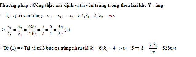 Trong thí nghiệm Y- âng về giao thoa ánh sáng, hai khe được chiếu bằng ánh sáng trắng có bước sóng từ 380 nm đến 760 nm. Trên màn quan sát, tồn tại vị trí mà ở đó có đúng ba bức xạ cho vân sáng ứng với các bước sóng là 440 nm, 660 nm và λ . Giá trị của λ gần nhất với giá trị nào sau đây?