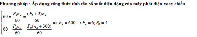 Hai máy phát điện xoay chiều một pha A và B (có phần cảm là rôto) đang hoạt động ổn định, phát ra hai suất điện động có cùng tần số 60 Hz. Biết phần cảm của máy A nhiều hơn phần cảm của máy B 2 cặp cực (2 cực bắc, 2 cực nam) và trong 1 giờ số vòng quay của rôto hai máy chênh lệch nhau 18000 vòng. Số cặp cực của máy A và máy B lần lượt là