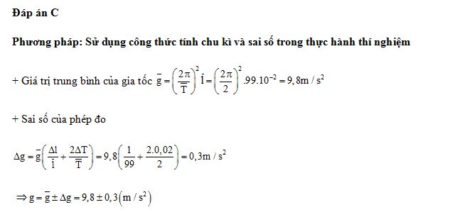 Tiến hành thí nghiệm đo gia tốc trọng trường bằng con lắc đơn, một học sinh đo được chiều dài con lắc đơn là 99 ± 1 (cm), chu kì dao động nhỏ của nó là 2,00 ± 0,02 (s). Lấy π2 = 9,87 và bỏ qua sai sốcủa số π. Gia tốc trọng trường do học sinh đo được tại nơi làm thí nghiệm là