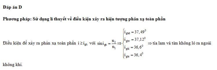 Chiếu một chùm sáng song song hẹp gồm bốn thành phần đơn sắc: đỏ, vàng, lam và tím từ một môi trưòng trong suốt tới mặt phẳng phân cách với không khí có góc tới 37°. Biết chiết suất của môi trường này đối với ánh sáng đơn sắc: đỏ, vàng, lam và tím lần lượt là 1,643; 1,657; 1,672 và 1,685. Thành phần đơn sắc không thể ló ra không khí là
