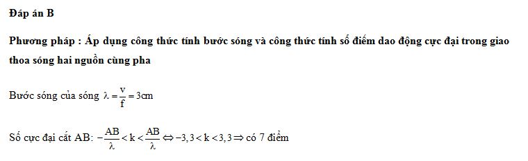 Giao thoa sóng ở mặt nước với hai nguồn kết hợp đặt tại A và B. Hai nguồn dao động điều hòa theo phương thẳng đứng, cùng pha và cùng tần số 10 Hz. Biết AB = 20 cm, tốc độ truyền sóng ở mặt nước là 0,3 m/s. Ở mặt nước, gọi D là đường thẳng đi qua trung điểm của AB và hợp với AB một góc 60°. Trên D có bao nhiêu điểm mà các phần tử ở đó dao động với biên độ cực đại?