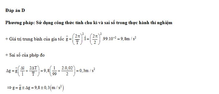 Tiến hành thí nghiệm đo gia tốc trọng trường bằng con lắc đơn, một học sinh đo được chiều dài con lắc đơn là 99 ± 1 (cm), chu kì dao động nhỏ của nó là 2,00 ± 0,02 (s). Lấy π2 = 9,87 và bỏ qua sai sốcủa số π. Gia tốc trọng trường do học sinh đo được tại nơi làm thí nghiệm là