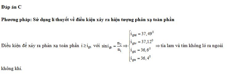 Chiếu một chùm sáng song song hẹp gồm bốn thành phần đơn sắc: đỏ, vàng, lam và tím từ một môi trưòng trong suốt tới mặt phẳng phân cách với không khí có góc tới 37°. Biết chiết suất của môi trường này đối với ánh sáng đơn sắc: đỏ, vàng, lam và tím lần lượt là 1,643; 1,657; 1,672 và 1,685. Thành phần đơn sắc không thể ló ra không khí là