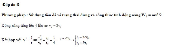 Xét nguyên tử hiđrô theo mẫu nguyên tử Bo. Electron trong nguyên tử chuyển từ quỹ đạo dừng m1 về quỹ đạo dừng m2 thì bán kính giảm 27r0 (r0 là bán kính Bo), đồng thời động năng của êlectron tăng thêm 300%. Bán kính của quỹ đạo dừng m1 có giá trị gần nhất với giá trị nào sau đây?
