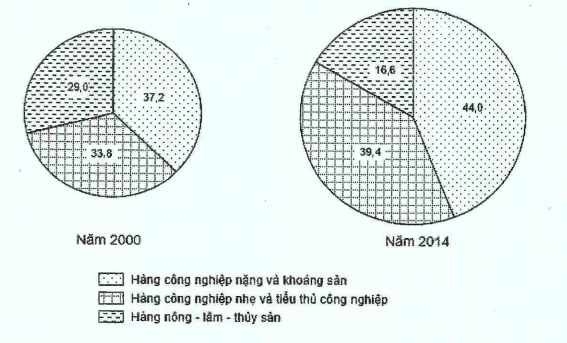 Cho biểu đồ sau: CƠ CẤU GIÁ TRỊ XUẤT KHẨU THEO NHÓM HÀNG, NĂM 2000 VÀ 2014 (%). (Nguồn số