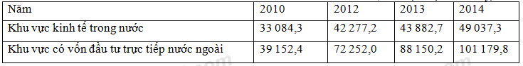 Để thể hiện sự dịch chuyển cơ cấu giá trị xuất khẩu hàng hóa theo khu vực kinh tế nước ta, giai đoạn 2010 – 2014 theo bảng số liệu, biểu đồ nào sau đây là thích hợp nhất?