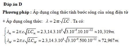 Một mạch dao động ở máy vào của một máy thu thanh gồm cuộn thuần cảm có độ tự cảm 3 µH và tụ điện có điện dung biến thiên trong khoảng từ 10 pF đến 500pF. Biết rằng, muốn thu được sóng điện từ thì tần số riêng của mạch dao động phải bằng tần số của sóng điện từ cần thu (để có cộng hưởng). Trong không khí, tốc độ truyền sóng điện từ là 3.108 m/s, máy thu này có thể thu được sóng điện từ có bước sóng trong khoảng